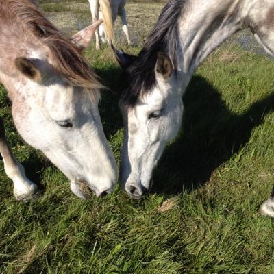 Les chevaux profitent d'un pré supplémentaire où l'herbe est tendre et délicieuse et surtout où ils peuvent se mettre les pieds dans l'eau pour dévorer les roseaux.